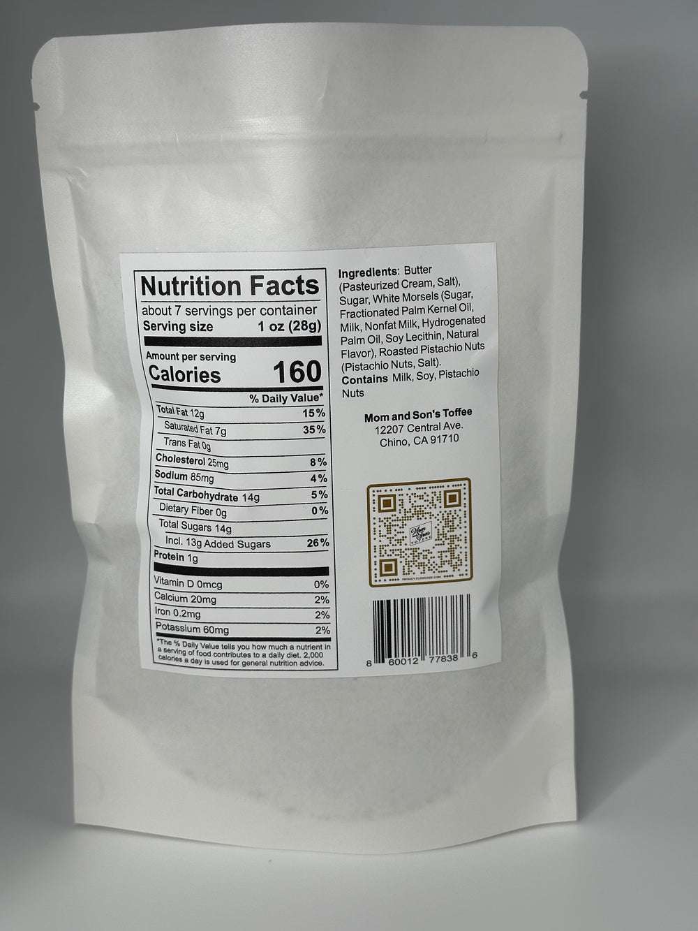 A refined blend of slow cooked butter and sugar, with premium pistachios and finished with silky white morsels. Handcrafted in small batches. Pistachio Pearl Toffee delivers an elegant balance of richness, crunch, and smooth sweetness in every bite.